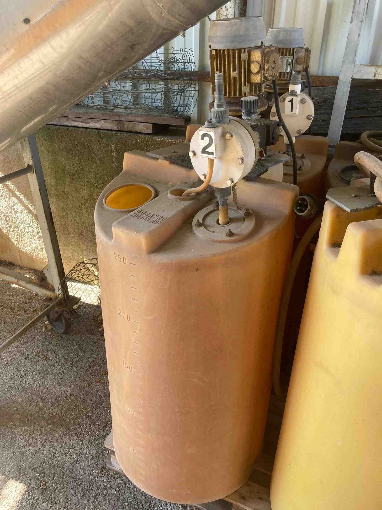 4 pompes doseuse Hauteur totale (cuve + pompe) : 150 cm Hauteur cuve : 110 cm Diamètre cuve : 60 cm Volume des cuves : 250 Litres Connexion électrique en triphasé Prix : 500 euros par sulfidoseurs (à débattre)